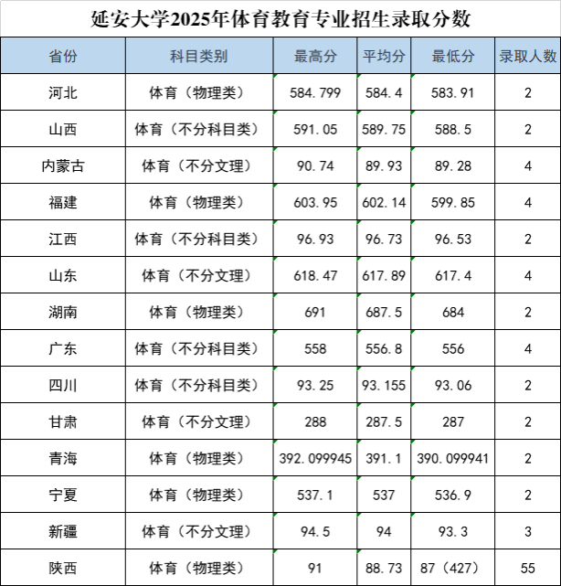 延安大学2025年体育教育专业招生录取分数